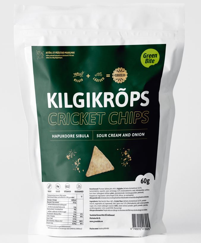 Toodetud Green Bite OÜ tellimusel EL-is KOOSTISOSAD : Punase läätse jahu 46%, kilgijahu (Acheta domesticus) 12,5%, kartulitärklis, rapsiõli, sool, vürtsisegu 3,5% (maltodekstriin, sool, sibulapulber, suhkur, kuiv koor (allergeeni allikas: piim), pärmiekstrakt, küüslaugupulber, petersell, happesuse regulaator: sidrunhape E330, lõhna- ja maitseaine)